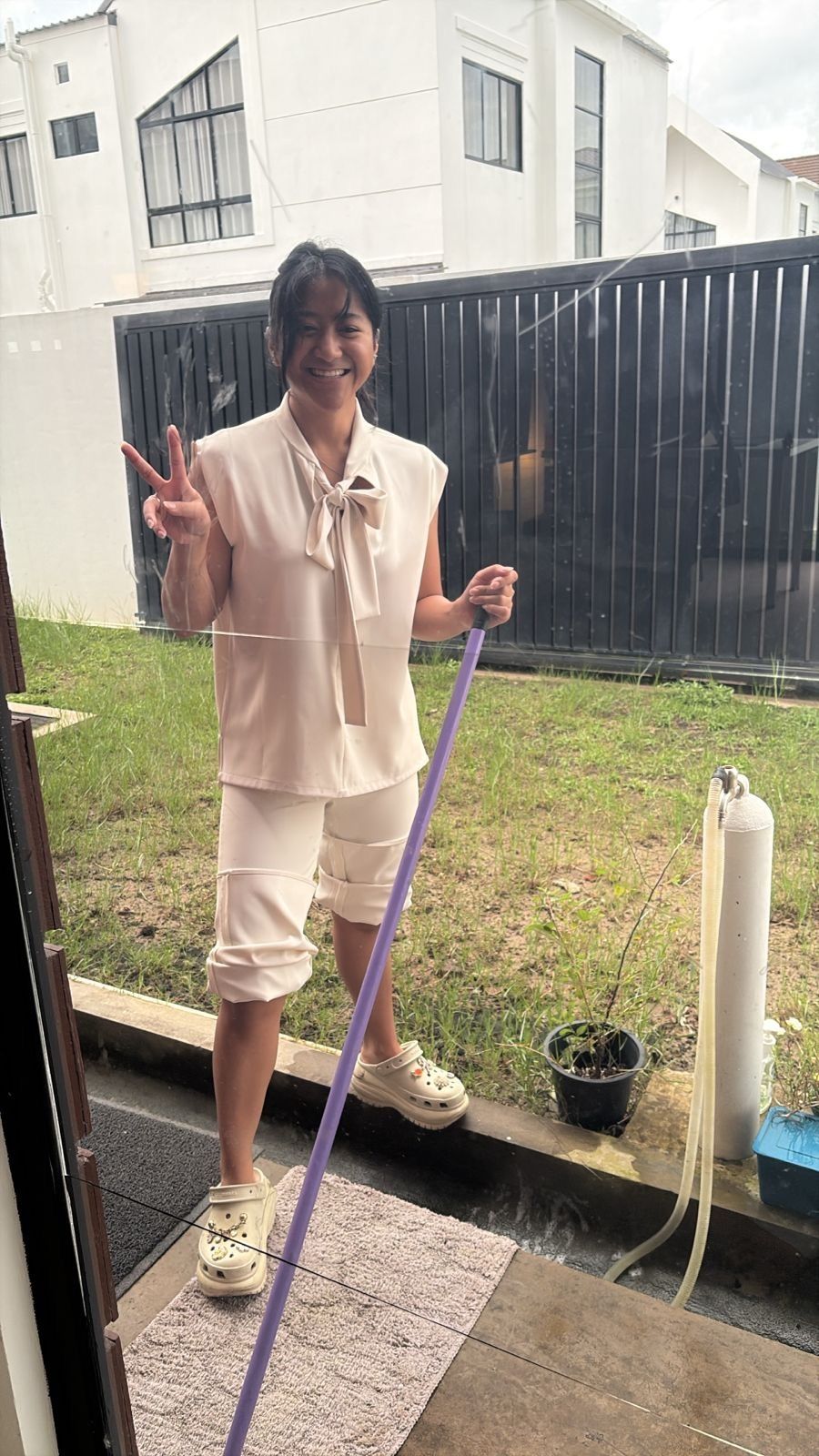 Batrisyia cleaning up the cat-pee-stained-doormat. (Yes, a cat peed on our doormat)
